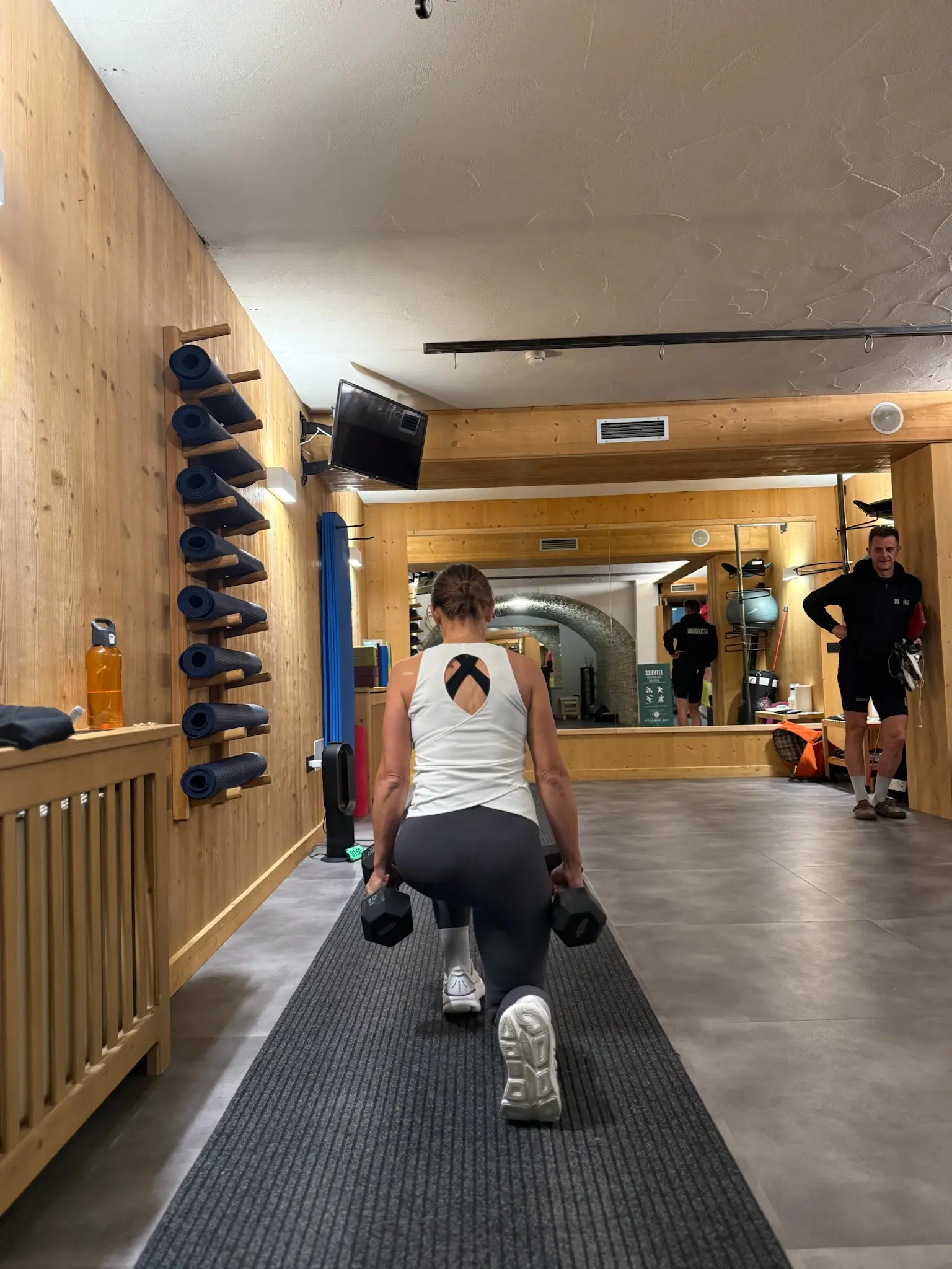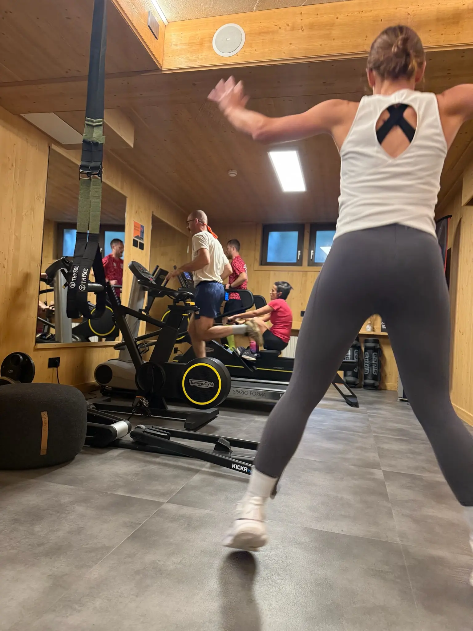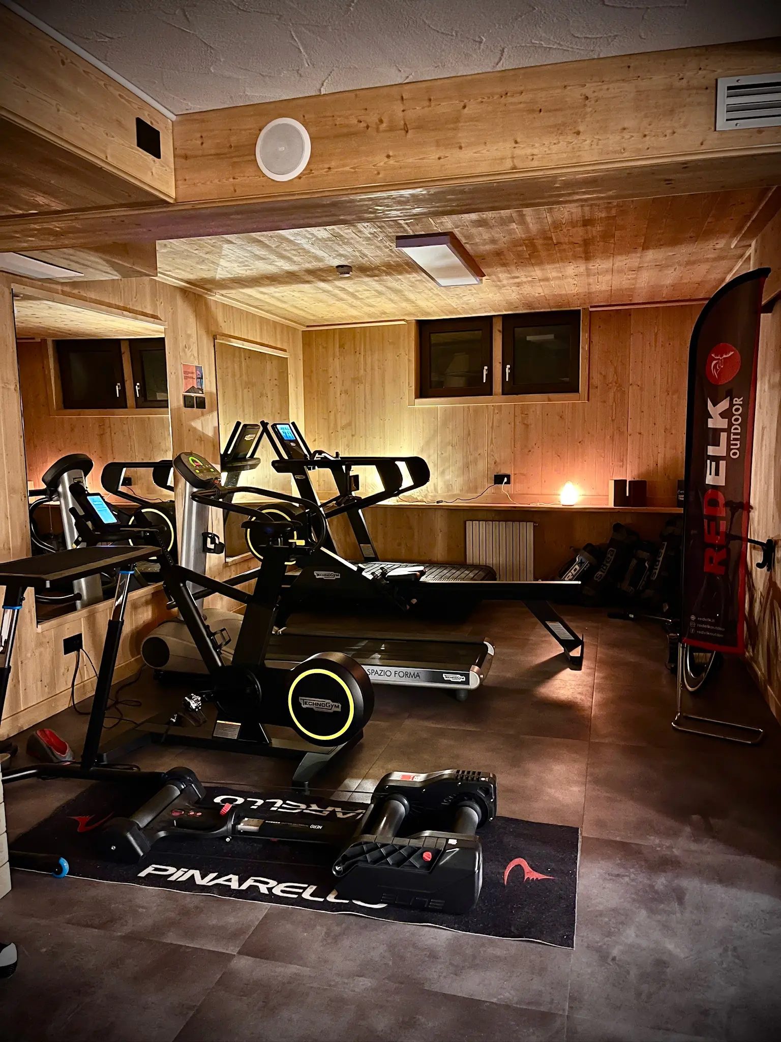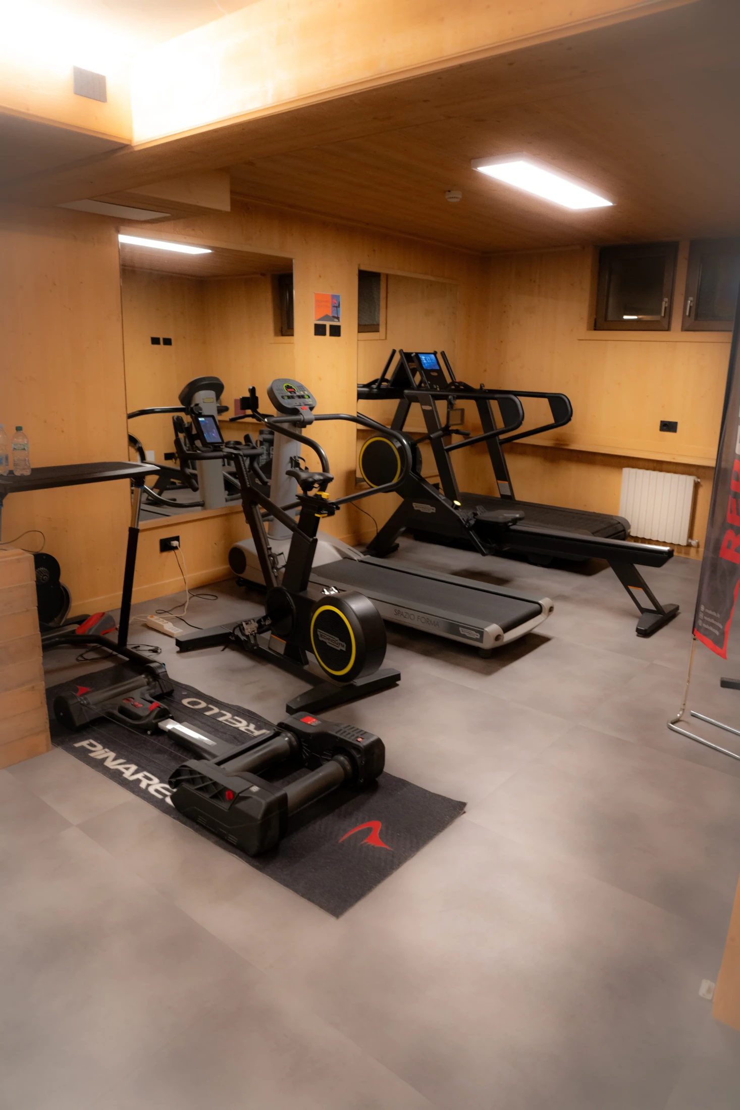 The indoor gym is a space dedicated to training throughout the year, designed to offer continuity and quality. It is equipped with professional Technogym machines, free weights, spin bikes, treadmills, step machines and small equipment for functional training. A minimalist and well-organised environment, ideal for complete sessions, from cardio to strength training.
