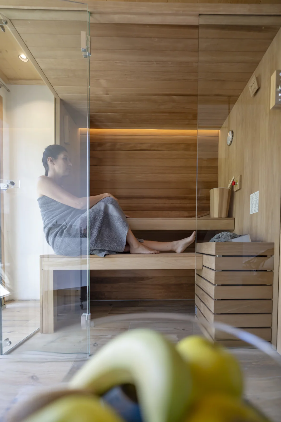 Interno di una sauna in legno con vista su un terrazzo e montagne innevate.